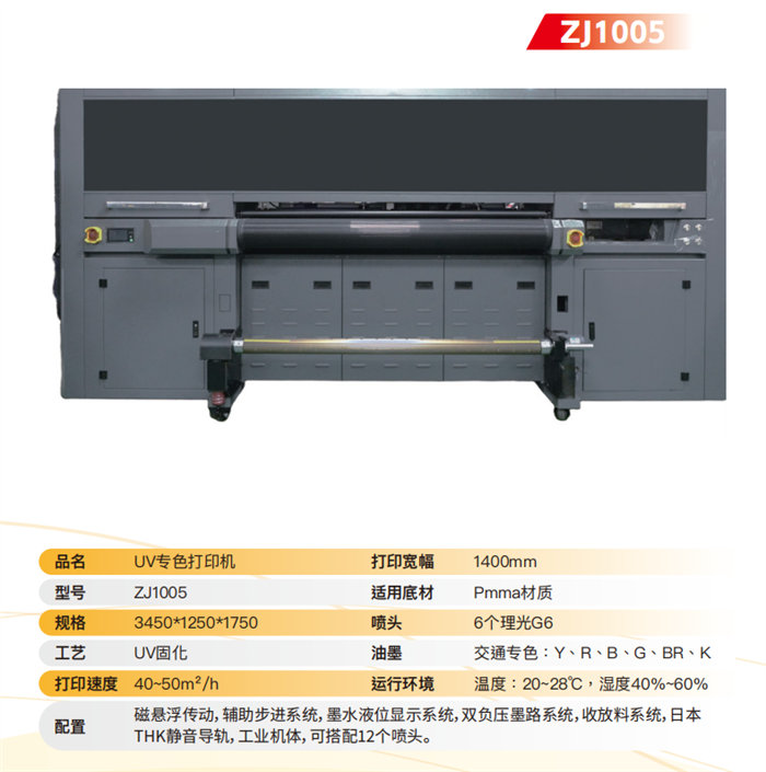 ZJ1005 UV Spot Color Printer: Designed specifically for PMMA materials, this machine features a 1400mm printing width and is equipped with 6 industrial-grade Ricoh G6 printheads. Capable of speeds up to 40-50m²/h, it perfectly handles specific traffic colors (Yellow, Red, Blue, Green, Brown, Black) with a magnetic levitation transmission for ultra-quiet and precise operation.
