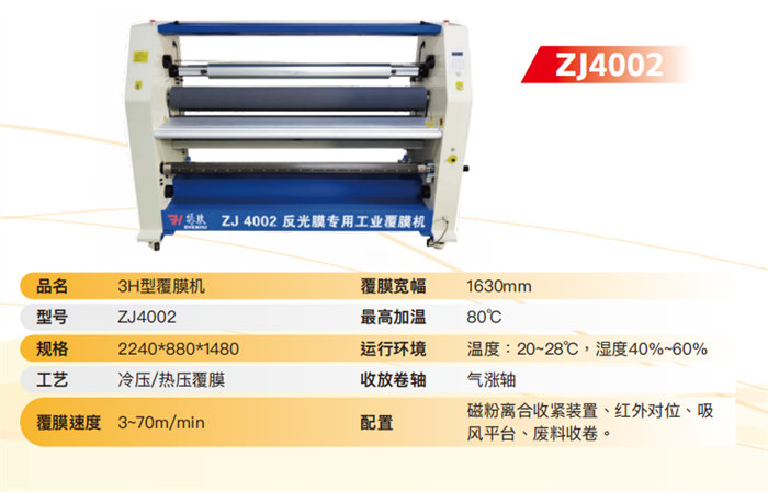 ZJ4002 3H-Type Dedicated Reflective Film Laminator (1630mm): An industrial-grade machine featuring magnetic powder clutch tension control, infrared alignment, and a vacuum suction platform, pushing speeds up to 3-70m/min.