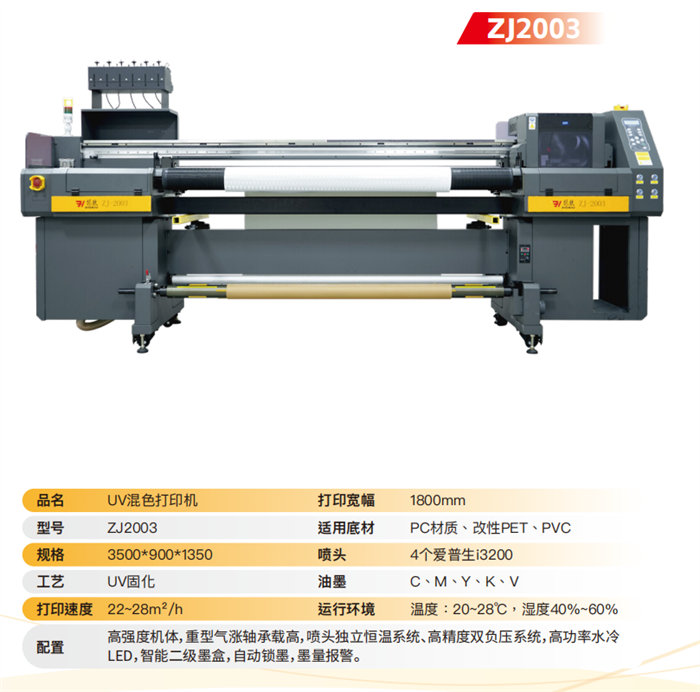 ZJ2003 UV Mixed Color Printer: A versatile powerhouse with an 1800mm width, utilizing 4 Epson i3200 printheads. Ideal for PC, modified PET, and PVC substrates, it delivers vibrant C, M, Y, K, V output at 22-28m²/h, supported by an intelligent secondary ink cartridge system.