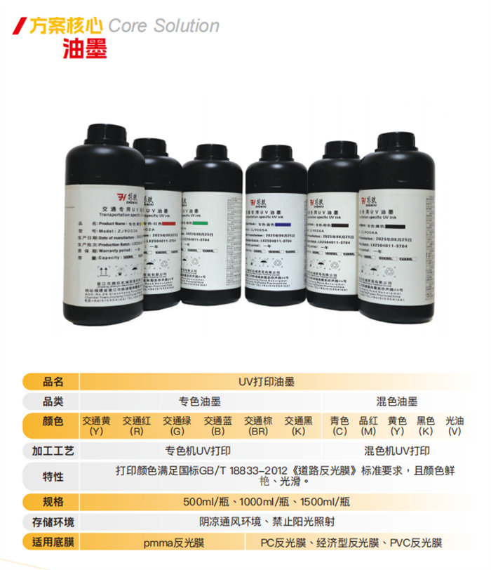 A printer is only as good as its ink. We proudly presented our proprietary Traffic-Specific UV Inks. Available in both spot and mixed color variants (500ml, 1000ml, 1500ml), these inks are rigorously formulated to meet the GB/T 18833-2012 road reflective film standards. They offer exceptional vividness, smooth finishes, and long-lasting weather resistance on PMMA, PC, and PVC reflective films.
